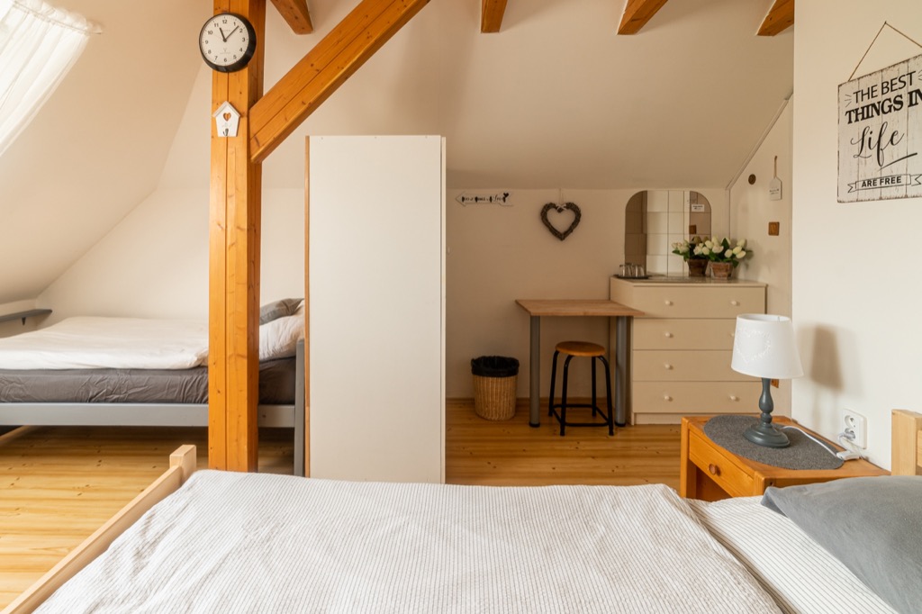Čtyřlůžkový pokoj s vybavenou kuchyňkou a sprchovým koutem, umyvadlem a vlastní wc na chodbě. |